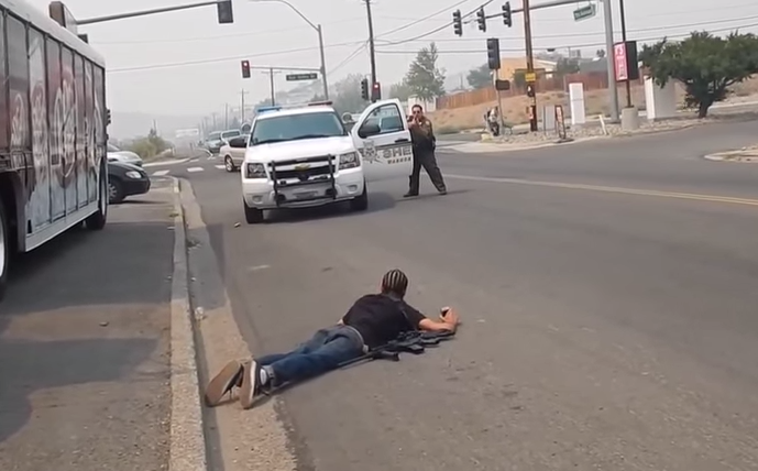 In the next video a Black guy is carrying his AR-15. Within 45 seconds the county sheriff's deputy comes up on him. He exits the vehicle with service weapon drawn. He tells the Black guy to eat dirt and don't move.